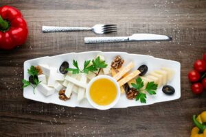 Сыры: мраморный, с пожитником, пармезан, фета, мёд, грецкий орех.
