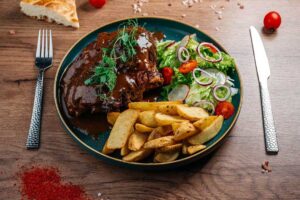 Говядина, микс салата, сыр Фета, огурец, помидор, кедровый орех, лимон, оливковое масло.